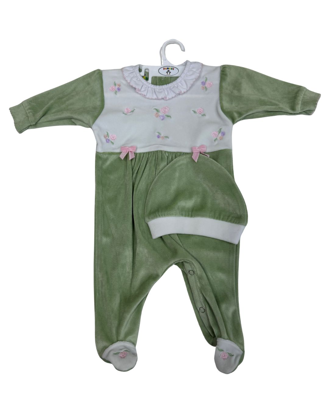 Découvrez notre nouvelle grenouillère de naissance en velours premium. 🌿 Un mélange parfait de vert sauge et de blanc avec de jolies broderies florales pour offrir à votre bébé un style élégant et un confort absolu. Vendu avec son petit bonnet assorti ! 👒